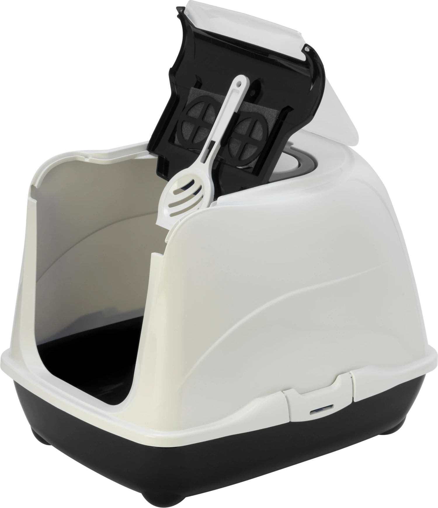 Le couvercle du bac à litière est muni d’une pelle, ce qui facilite son nettoyage. De plus, la poignée située sur le dessus permet de lr transporter facilement.