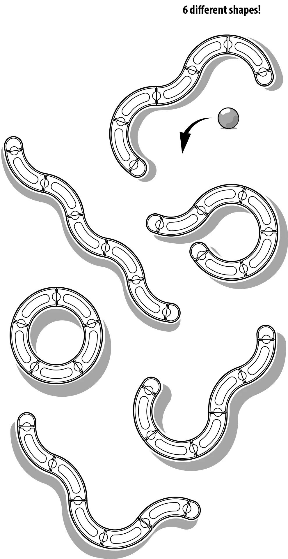 Jouet interactif pour chat. Le tunnel contient une balle qui émet un son de cliquetis pour une stimulation supplémentaire pendant le jeu. Le jouet se compose de 7 parties différentes que vous pouvez connecter ensemble en 6 formes avec un simple système de clic. En bas, des pieds en caoutchouc antidérapants protègent votre sol et maintiennent le jouet en place.