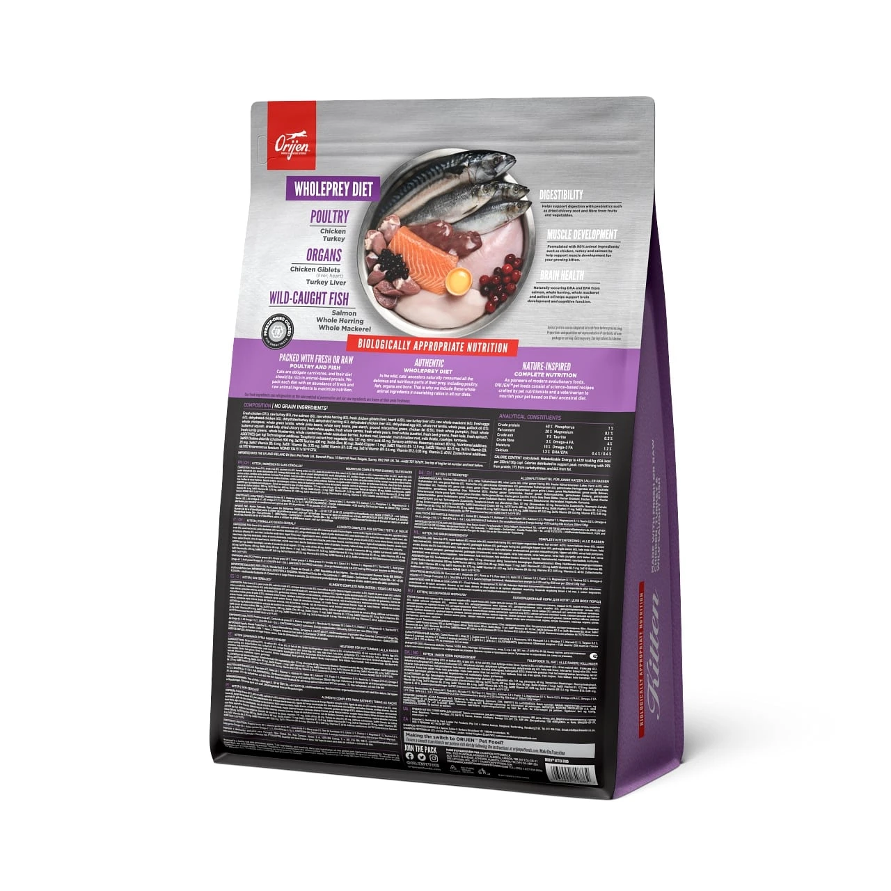 ORIJEN Kitten Diet est spécialement formulé pour apporter à votre chaton les nutriments dont il a besoin pour devenir sain et fort. Composé à 90 % d’ingrédients d’origine animale de haute qualité tels que le poulet, la dinde et le saumon, il contribue au développement musculaire de votre chaton en pleine croissance. Il contient également 15 ingrédients frais ou crus, tels que les muscles, les organes et les os, les parties les plus succulentes et les plus nutritives des proies. Cette alimentation contribue au développement du cerveau et des fonctions cognitives de votre chaton grâce au DHA et à l’EPA d’origine naturelle provenant du saumon, du maquereau et du hareng entiers, ainsi que de l’huile de colin. En lui donnant des proteines animales fraîches et crue, votre animal s’épanouira.