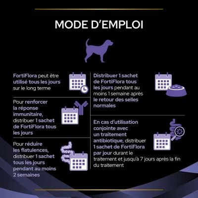 FortiFlora est hautement appétent et peut être saupoudré facilement sur la nourriture. Un sachet par jour apporte à votre animal la quantité efficace de Probiotique. Il est recommandé de poursuivre le traitement de votre animal pendant une période de 30 jours, même si les signes cliniques se dissipent avant.